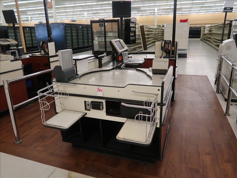 CHECKSTAND TO INCLUDE: SCANNER, SLIP PRINTER, READOUT MONITOR, CHANGE MAKER, CUSTOMER MONITOR, TURNTABLE, 12' CHROME DIVIDER & BAG STANDS