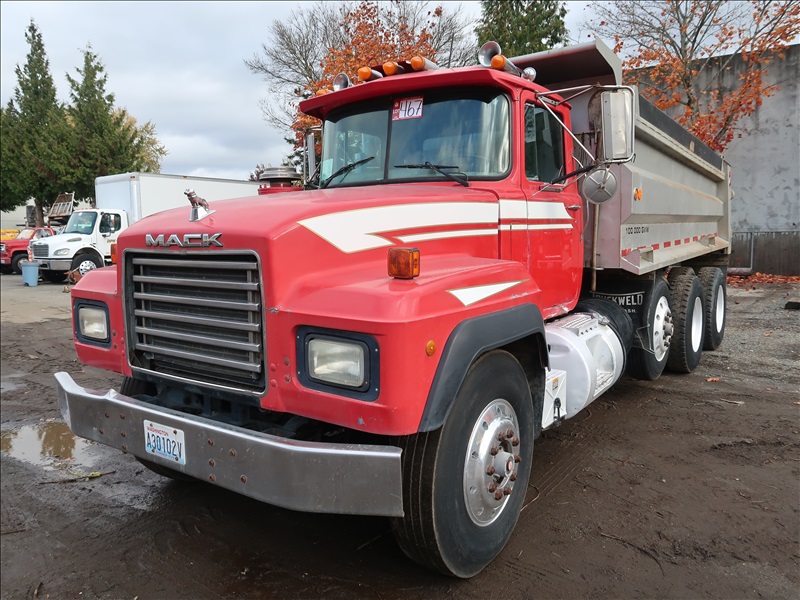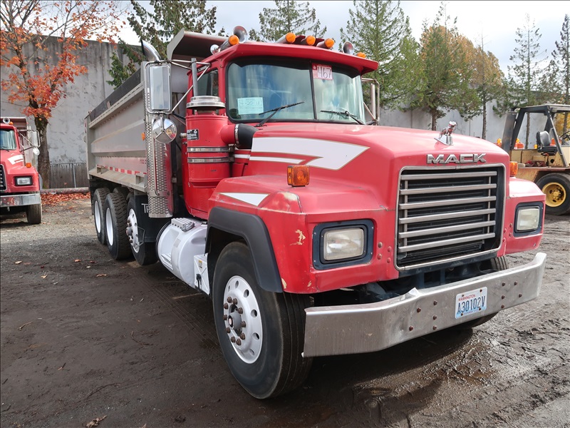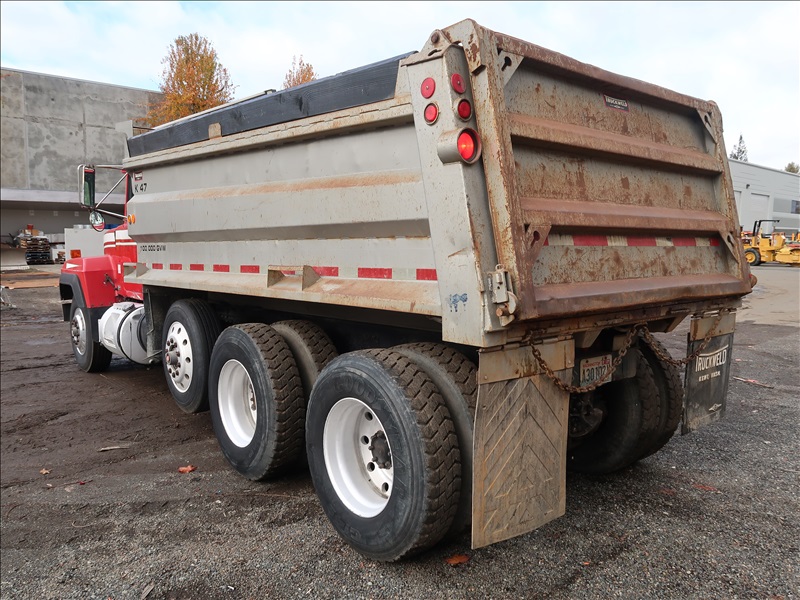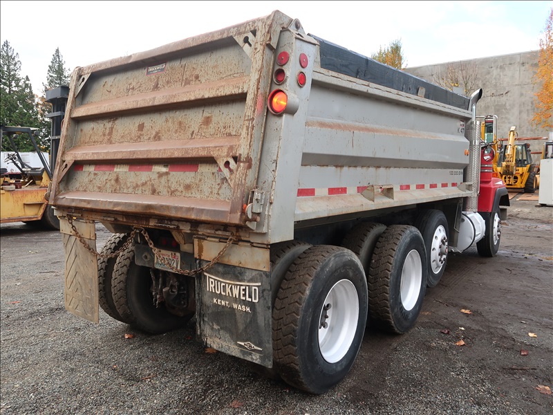 TRI/A DUMP TRUCK, E7-400 MAXITORQUE, 18 SPD, CAMEL BACK SUSPENSION, 15'6" STEEL BOX, PLUMBED FOR PUP, ODOMETER READS: 414,189, HOUR METER READS: 28,134