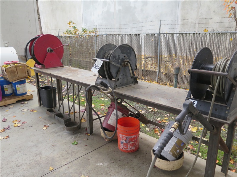 WASH STATION STEEL TABLE W/(2) PRESSURE WASHER HOSE REELS, WANDS & (1) WATER HOSE REEL