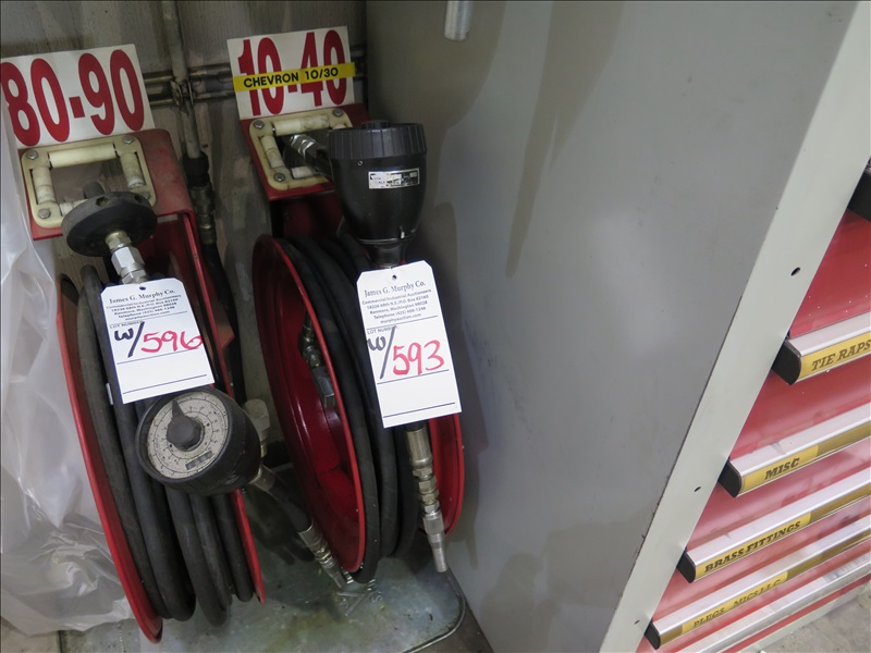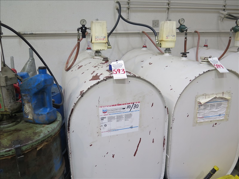 200 GAL BULK OIL TANK W/PNEUMATIC PUMP, HOSE REEL W/METERED NOZZLE, 10/30 OIL, 3/8+/- FULL