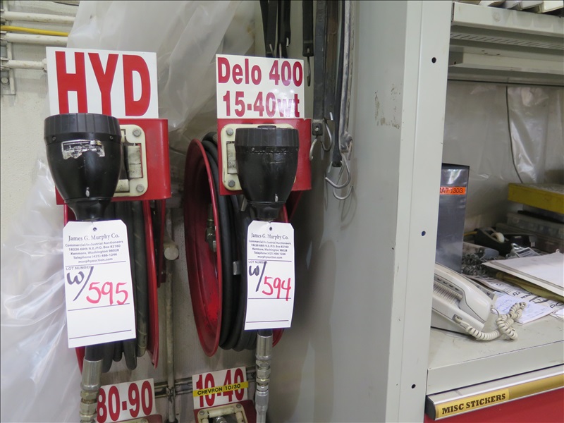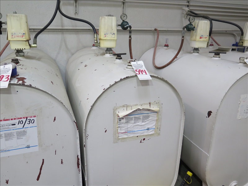 200 GAL BULK OIL TANK W/PNEUMATIC PUMP, HOSE REEL W/METERED NOZZLE, 15/40 OIL, 1/4+/- FULL