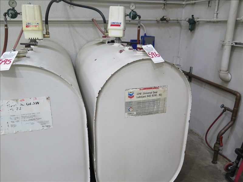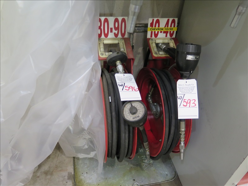 200 GAL BULK OIL TANK W/PNEUMATIC PUMP, HOSE REEL W/METERED NOZZLE, 80/90 OIL, 3/8+/- FULL