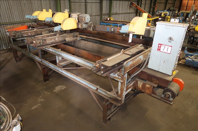 MULTI-SAW 5-HEAD TRIMMER, 16' CAPACITY, 7-1/2 HP MOTORS, 4' 5-STRAND FEED THRU TRANSFER, OUTFEED & CHAIN BELT, GEARHEAD MOTORS