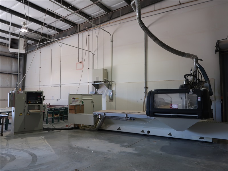 CNC ROUTER MACHINING CENTER, 5'X12' TABLE, 12-HEAD AUTOMATIC TOOL CHANGER, SCM CONTROLS, HANDHELD REMOTE, (3) VACUUM PUMPS, COOLING SYSTEM, 60HZ, TRANSFORMER & DISCONNECTS ON WALL, FLEX HOSE ONLY