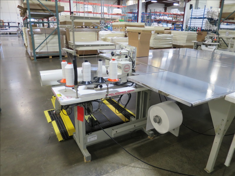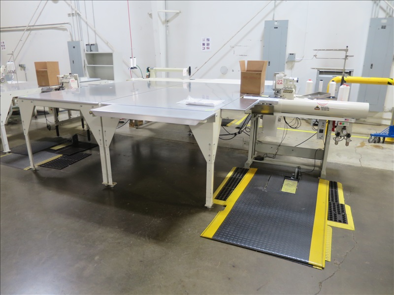 HIGH LIFT FOOT PANEL FLANGER W/JUKI MO-6916G SERGER HEAD & (2) 4' X 8' AIR TABLES, 220V, SINGLE PHASE