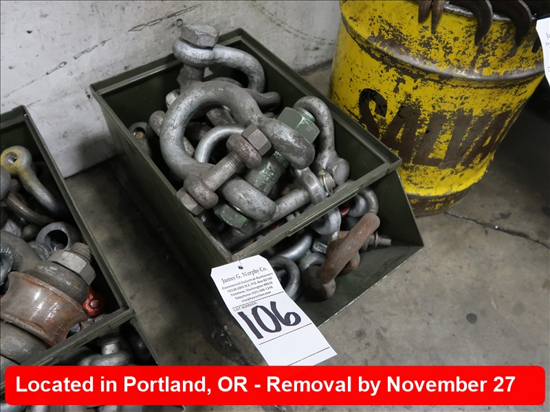 LOT, ASSORTED SHACKLES IN THIS STEEL BIN