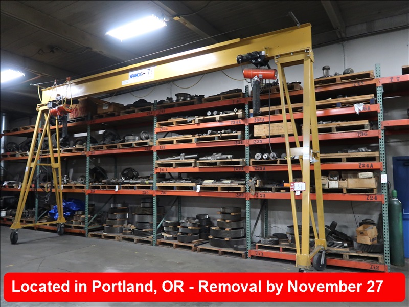 7-1/2 TON PORTABLE BRIDGE CRANE W/APPROX 20' SPAN, (2) CM LODESTAR 3 TON ELECTRIC CHAIN HOISTS W/POWER TRAVEL & PENDANT CONTROLS