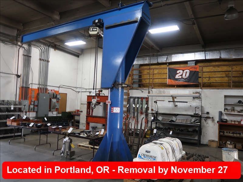 2 TON CAPACITY SHOP BUILT SWING ARM JIB W/COFFING 2 TON ELECTRIC CHAIN HOIST W/PENDANT CONTROLS