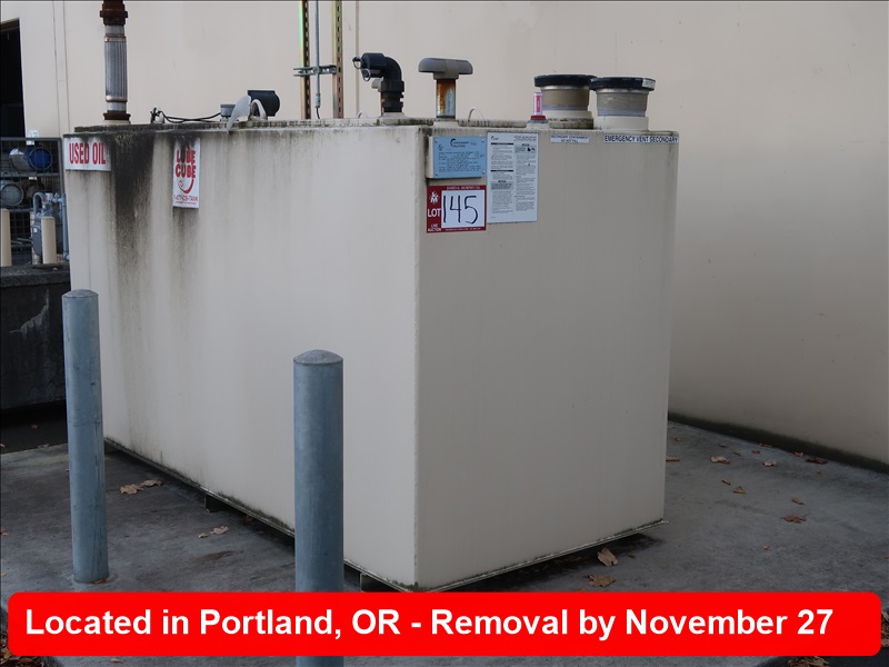 1,000 GALLON SECONDARY CONTAINMENT ABOVE GROUND TANK FOR FLAMMABLE LIQUIDS W/BJE TANK MONITOR & SOLENOID VALVE FROM GRACO HUSKY 1590 PNEUMATIC PUMP (TANK LOCATED OUTSIDE OF MACHINE SHOP, TANK MONITOR, ETC LOCATED BY BACKDOOR AT RACK "EE")