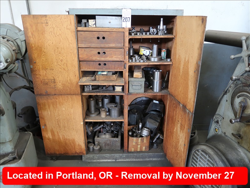 LOT, ASSORTED TOOLING & ACCESSORIES W/WOOD CABINET