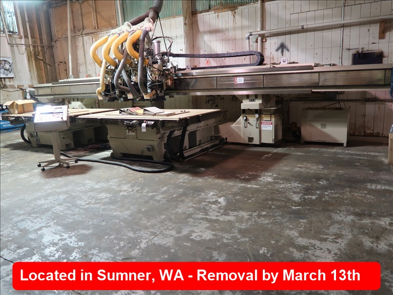 CNC ROUTER TABLE W/(4) MAIN ROUTER HEADS & (4) PIGGYBACK HEADS, 24' OF TRAVEL, TWIN 5' X 8' VACUUM TABLES, TRAVAINI DYNASEAL 40 HP VACUUM PUMP, FANUC CONTROLS, APPROX 15 HP/18" FAN IN RAFTERS W/PIPING TO MACHINE, MARKED ELECTRICS & PARTS