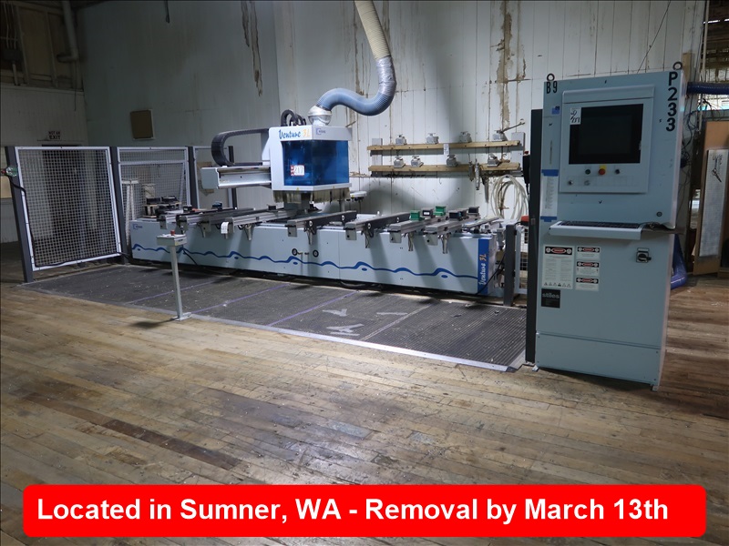CNC 3-AXIS PROCESSING CENTER, 4,250MM X 1,250MM X 125MM WORKING FIELD, (19) VERTICAL & (6) HORIZONTAL DRILLING SPINDLES, (1) ROUTING SPINDLE W/9 KW, (1) C-AXIS W/HSK-F-63, (1) GROOVING SAW (0125MM 90-DEGREE), 14-TOOL CHANGER IN X-DIRECTION, BECKER 3 HP VA