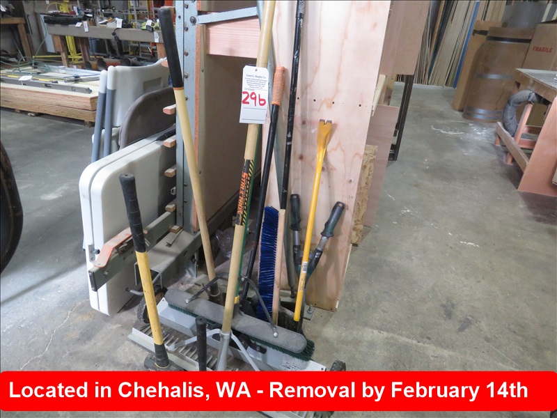 LOT, MAGNETIC RAKE, TAMPER, SHEARS, (2) SLEDGEHAMMERS & CLEANING SUPPLIES