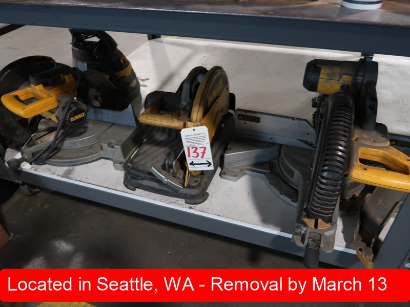 LOT, (2) DEWALT MITER SAWS, DEWALT CUT-OFF SAW & DEWALT VACUUM (NEEDS SERVICE)