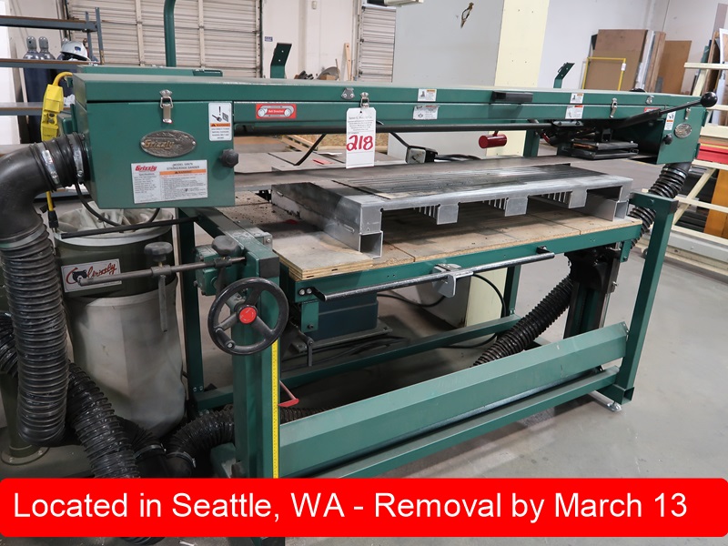 6" X 186" BELT STROKE/EDGE SANDER W/59" X 23-3/4" TABLE, 21" VERTICAL TRAVEL, 18" HORIZONTAL TABLE TRAVEL, 50-1/2" PLATEN PRESS TRAVEL, GRIZZLEY SINGLE BAG DUST COLLECTOR, 220V, SINGLE PHASE