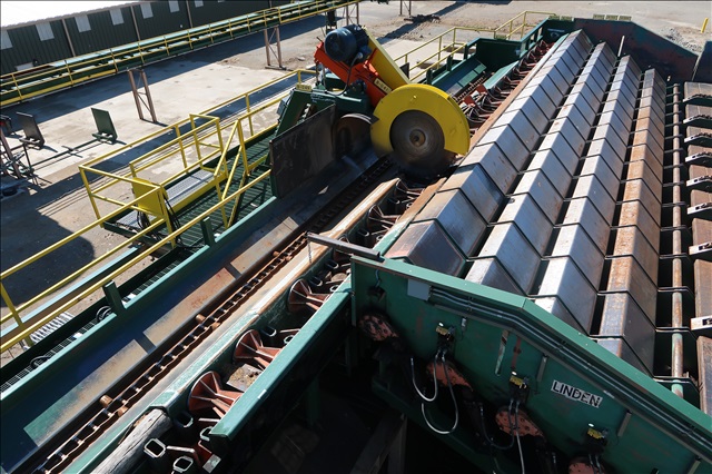 60' CUT OFF SAW FEED THRU HOURGLASS ROLLCASE W/(18) 12" HOURGLASS ROLLS, (7) LOG STOPS, 5-ARM LOG KICKER, EATON/VICKERS VALVES, ACCUMULATOR (EQUIP# 4104)