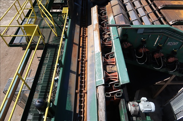 17"X92' LOG TRANSFER BELT FROM STEP FEEDERS, H&T DRUMS, POWERED 18"X20" HOURGLASS ROLL, TOSHIBA 25 HP MOTOR TO SUMITOMO REDUCER (EQUIP# 4137)