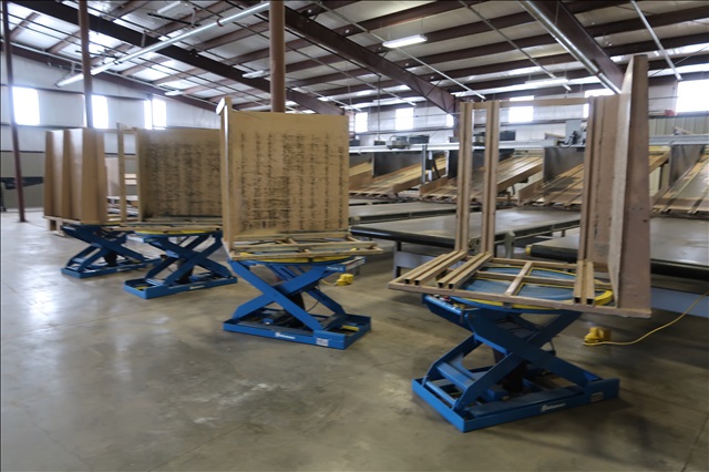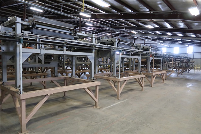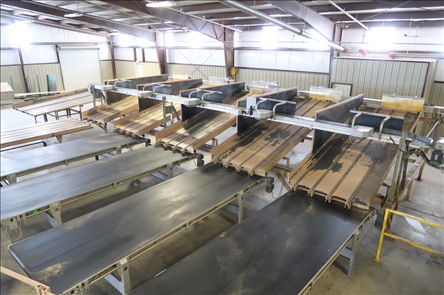(10) MANUAL STACKING STATIONS W/(2) 8"X37' SORTING BELTS W/KICKERS TO (10) APPROX. 5'W X 14'L GRAVITY ROLL SLIDE TABLES TO (10) APPROX. 5'X15' POWERED SORTING BELTS, (10) 2016 BISHANNON EZ LOADER AUTOMATIC PALLET POSITIONERS, 4000 LB., 10-60 PSI W/43" TABLE & UNIT STACKING FRAMES