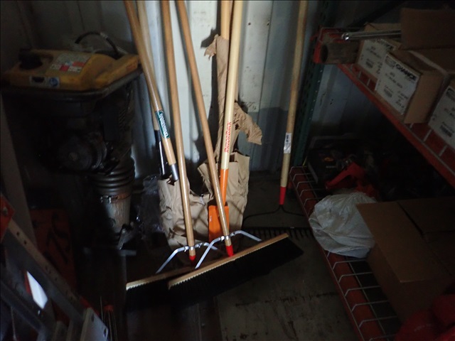 GROUP OF UNUSED, 2 BROOMS, 5 SHOVELS, 1 RAKE