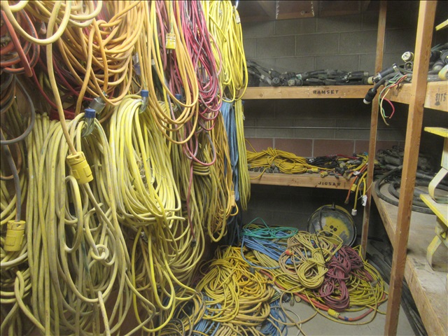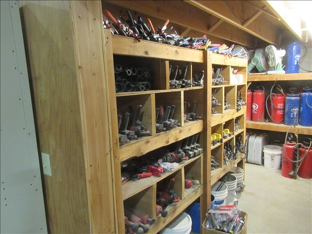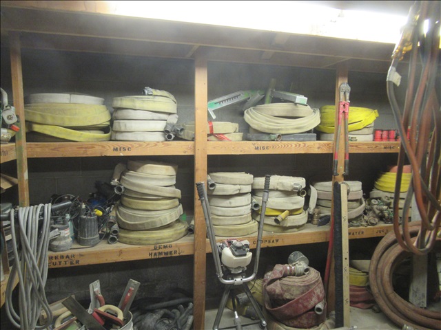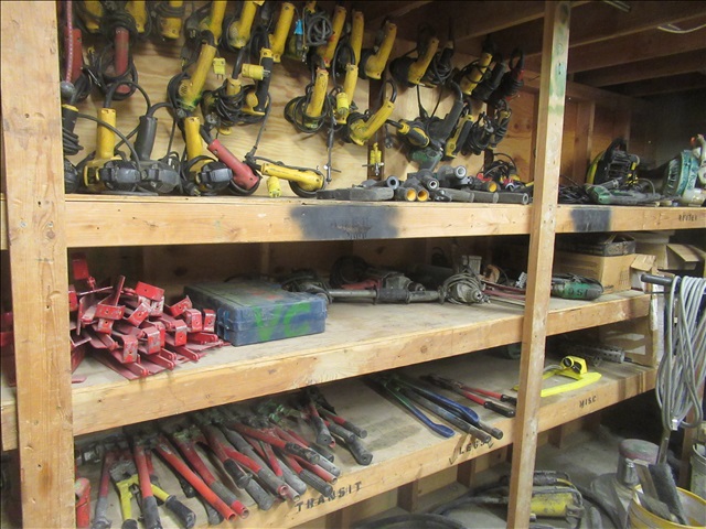 GROUP OF MISC. TOOLS TO INCLUDE: DRILL MOTORS, VIBRATORS, PUMPS, SCREED, BLOWERS, COME-A-LONGS, EXTENSION CORDS, HOSE, PIG TAILS, ADAPTERS, BROOMS, SHOVELS, RACKS, DOLLIES, PICKS, SCRAPERS, STANDS, ROLLERS, 3RD HANDS, CAULKING GUNS, SPRAYERS, FANS, PORTAB