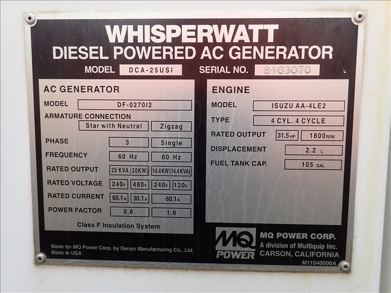 25KVA/14.4KW PORTABLE GENERATOR, ISUZU 4 CYL