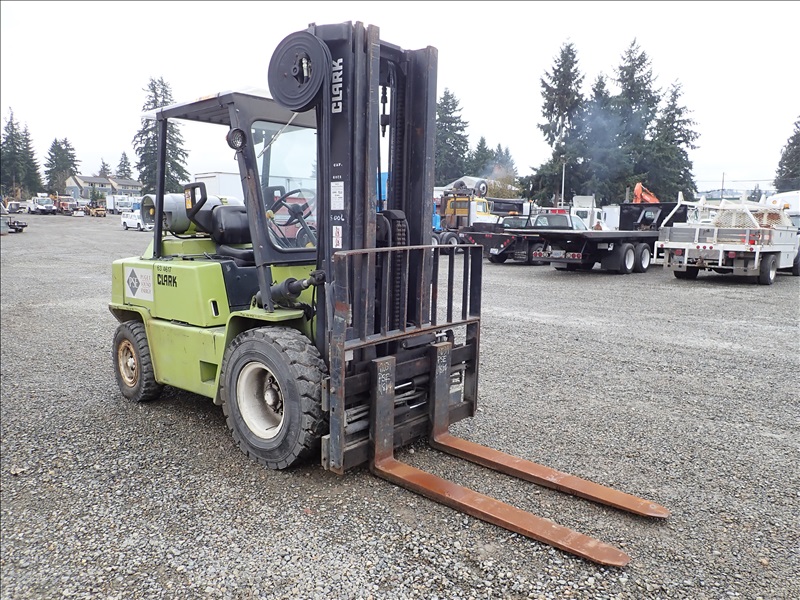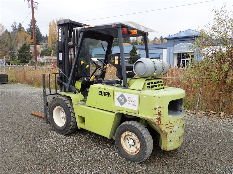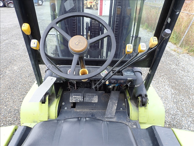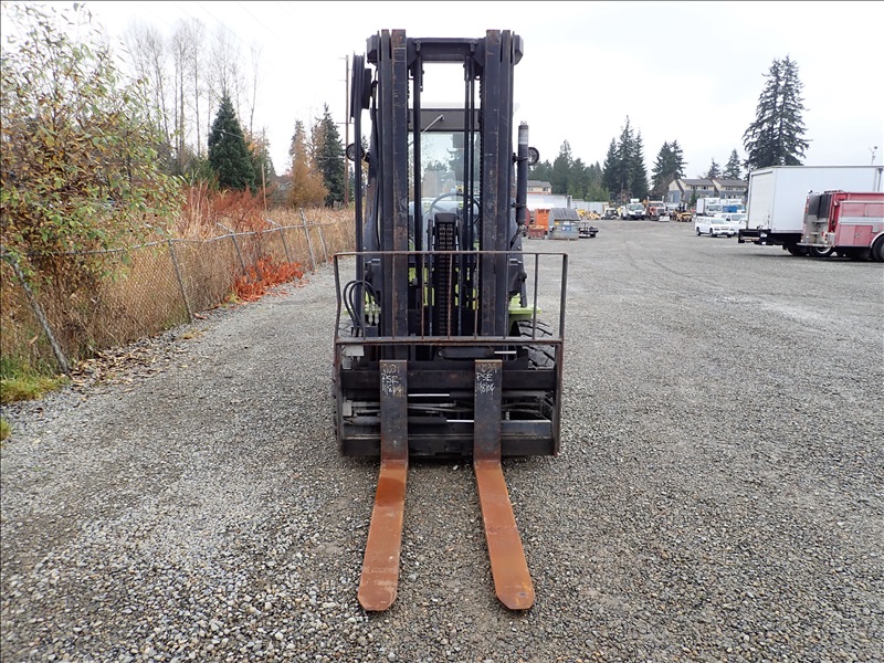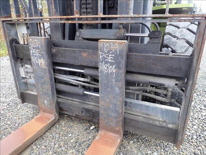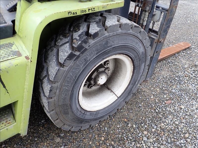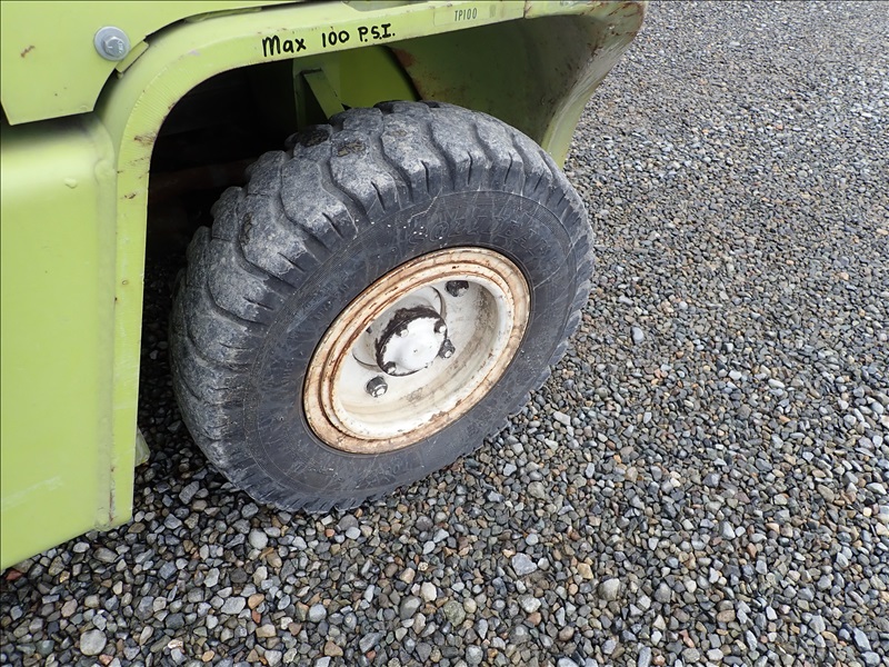 8,000 LB PNEUMATIC TIREFORKLIFT, 199" FORK HEIGHT,3-STAGE MAST, SIDE SHIFT,FORK POSITIONERS, HYDACCUMULATOR, PERKINS 4 CYL LPGHOUR METER READS: 2,633