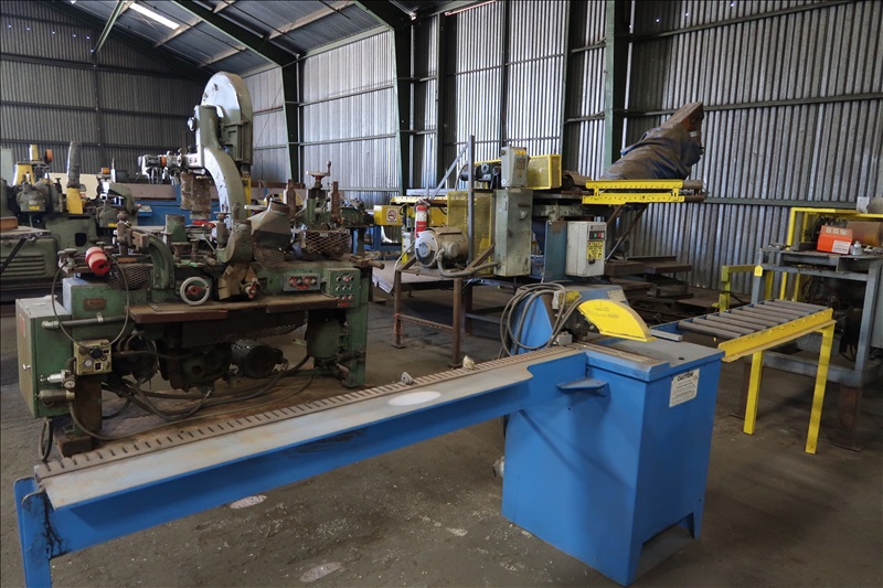 CHOP SAW W/INFEED GRAVITY ROLLS & OUTFEED LUMBER GAUGE