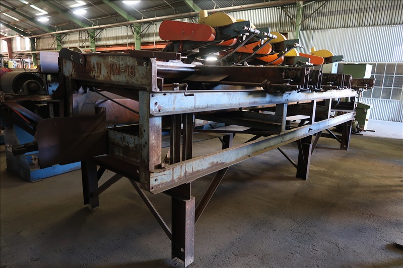 MULTI-SAW 5-HEAD TRIMMER, 16' CAPACITY, 7-1/2 HP MOTORS, 4' 5-STRAND FEED THRU TRANSFER, OUTFEED & CHAIN BELT, GEARHEAD MOTORS