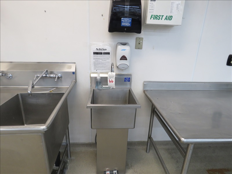 18" SS HAND SINK W/FOOT CONTROLS, SOAP & PAPER TOWEL DISPENSER ($100 DEPOSIT REQUIRED)
