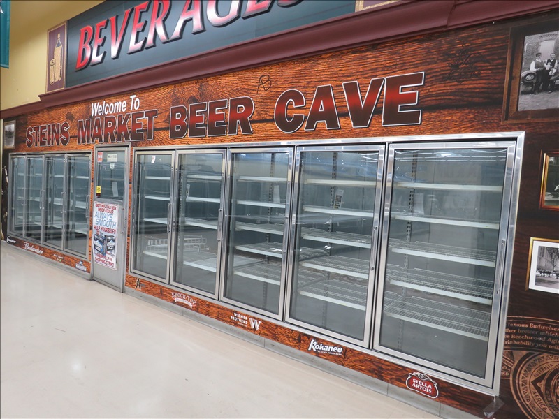 APPROX 36' X 12' X 10' 9-DOOR WALK-IN BEER DISPLAY COOLER W/MAN DOOR, DOUBLE SWING DOORS, SHELVING & (3) LARKIN 3-FAN EVAPORATORS, LIGHTS & ANTHONY DOORS (NO COMPRESSOR)