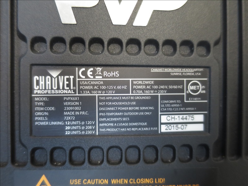 APPROX. 15'X20' 120-PANEL INTERCHANGEABLE OUTDOOR-RATED VIDEO WALL W/BLOW-THROUGH CAPACITY, BRILLIANT SMD 2623 LEDs & PIXEL PITCH OF 6.9 MM. PANEL SIZE IS APPROX. 19"X19" & SYSTEM COMES WITH CASES (RECENTLY REFURBISHED).