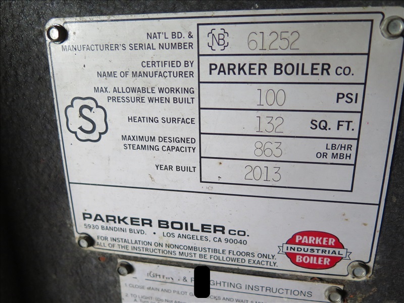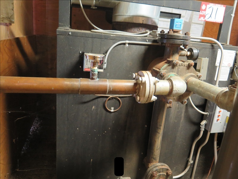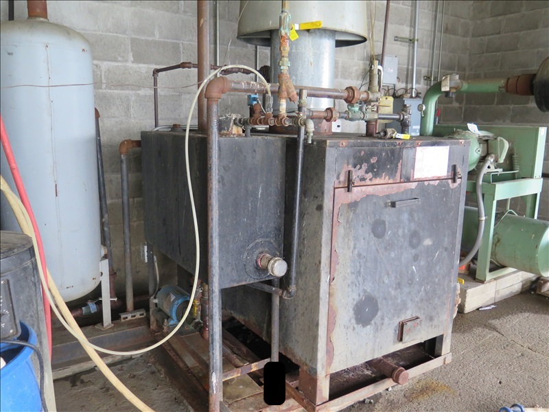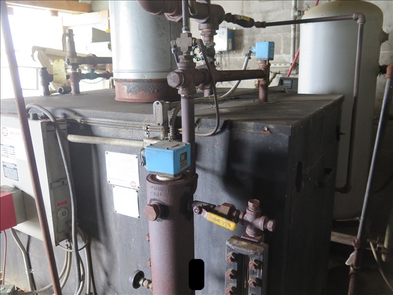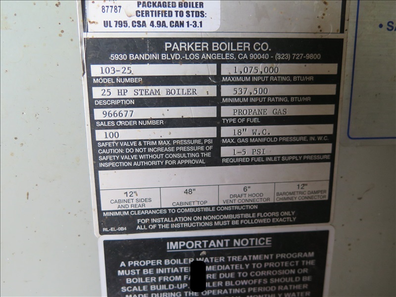 25 HP STEAM BOILER, 1,075,000 BTU, 100 PSI, PROPANE (GAS LINE BREAKS @ 1ST COUPLER, $250 REFUNDABLE DEPOSIT REQUIRED FOR GAS LINE CAP, WATER LINE BREAKS @ 1ST COUPLER, POWER BREAKS @ SAFETY SWITCH, SAFETY SWITCH STAYS W/BLDG)