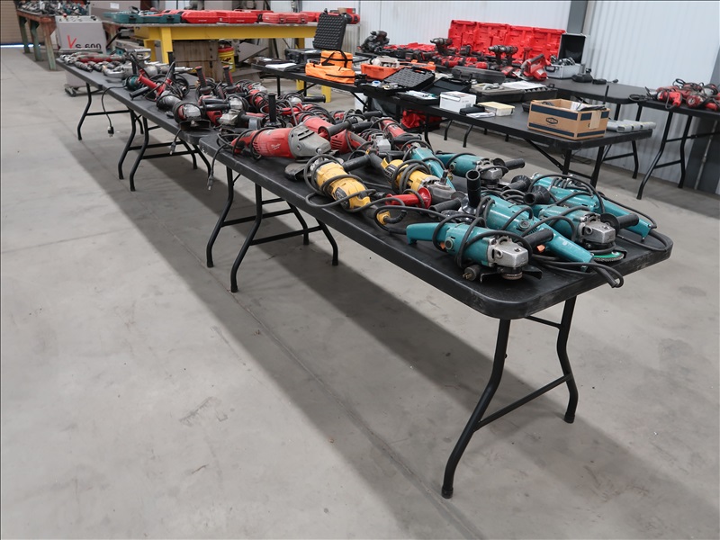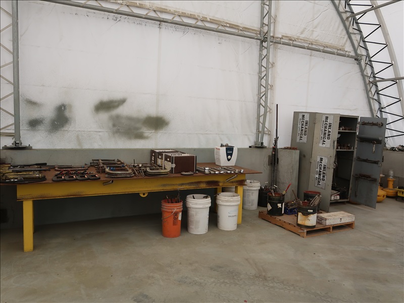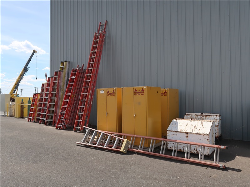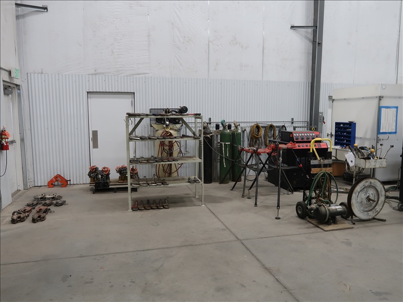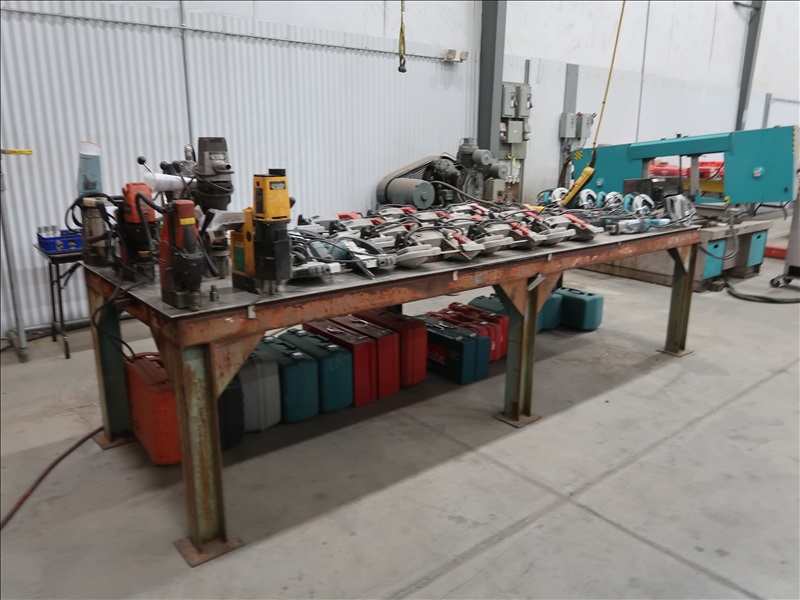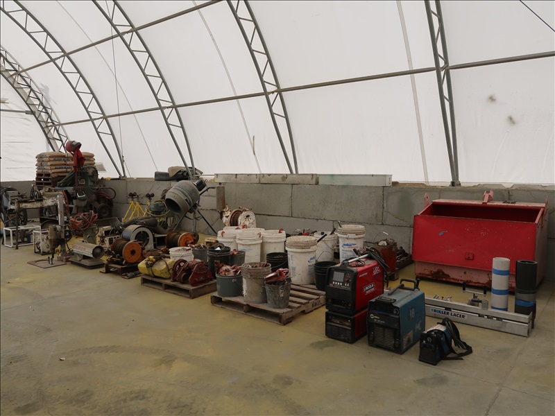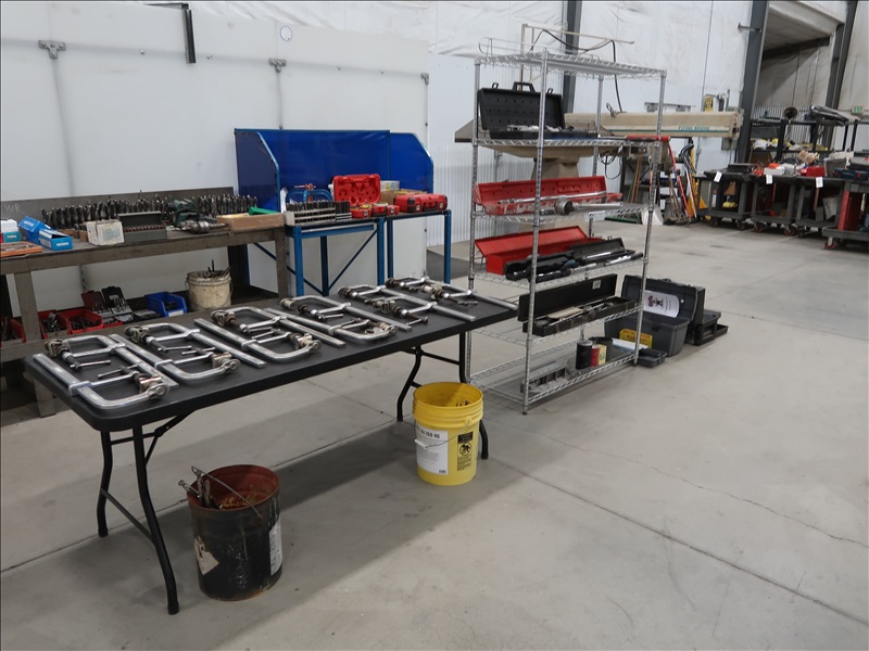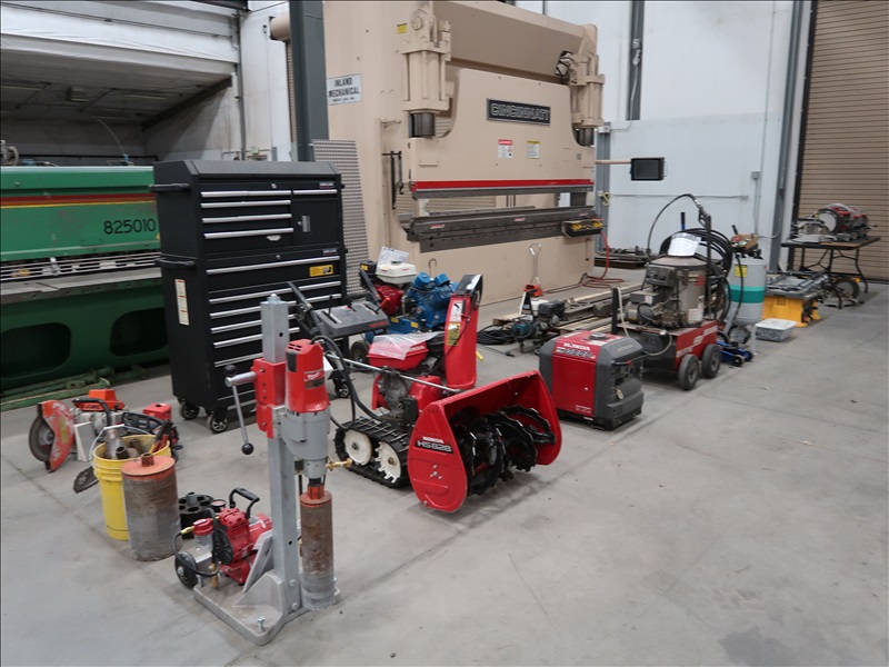 INGERSOLL RAND 5 HP & 10 HP TANK MOUNTED COMPRESSORS, 2007 4' X 7' 200 PSI AIR RECEIVER, SAND BLASTER, A-FRAME HOIST, QUANTITY OF POWER & HAND TOOLS, WINCHES, PIPE ROLLS, SPRAYERS, GARNET, KLEEN BLAST, STEEL TALES, ROLLCASE, POLY TANKS, STEEL SAWHORSES &