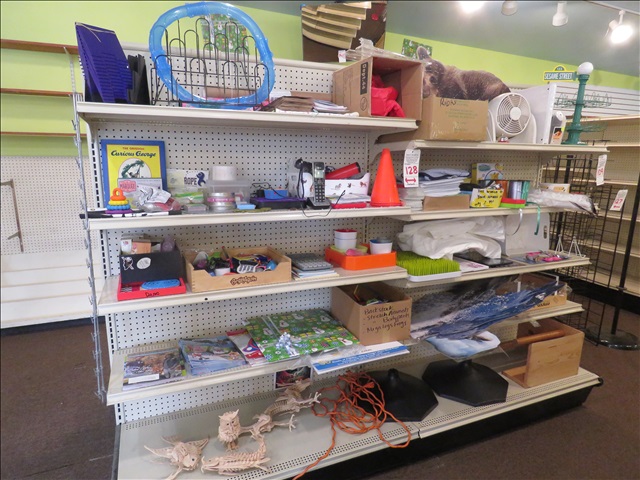 LOT, ASSORTED TOYS, SIGNS & ETC ON THESE SHELVES