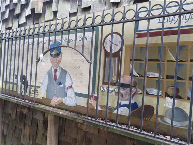 COUNTRY VILLAGE TICKET TAKER PAINTING ON BARN WOOD W/WROUGHT IRON WINDOW