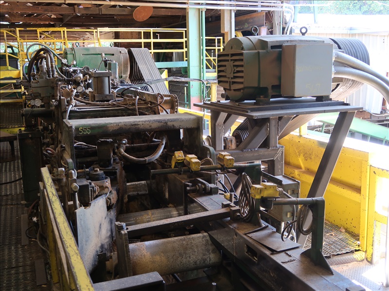 GANG EDGER W/(1) ACC 350 HP/1,7750 RPM/445T FRAME & (1) TOSHIBA 300 HP/1,775 RPM/449T FRAME MOTORS, #2 INVOLUTE SPLINED BOTTOM ARBOR, CHROMED FEED ROLLS, SIDE PRESS ROLL & HOLD DOWNS, APPROX 24' & 30' INFEED ROLLCASES W/FIXED LINE BAR, (19) KNURLED & SMOOTH 8-1/2" X 21-1/2" ROLLS, SKK GEARHEAD MOTORS, 22" X APPROX 24' OUTFEED BELT W/SKK GEARHEAD MOTOR, GANG SIDE PRESS ROLL & HYDRAULIC UNITS, (1) AT 30 HP & (2) AT 20 HP, WATERMIZER SYSTEM, 550 & 240 GALLON LUBE OIL TANKS, SPARE GUIDES & PARTS