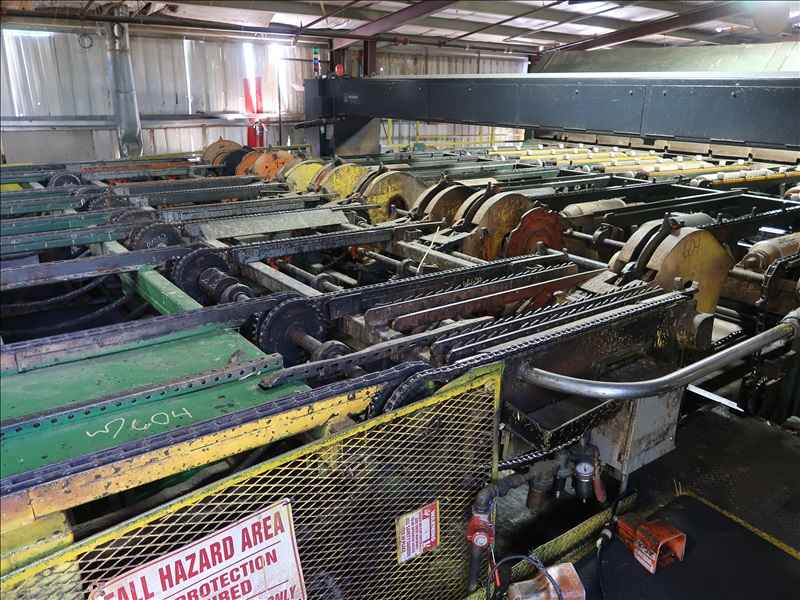 TONG DOG LOADER W/9' X 6-LUGS INFEED TRANSFER W/INDIVIDUALLY HYDRAULIC DRIVEN EVEN END ROLLS, 9' 8-STRAND 2-SECTION INFEED W/SKK GEARHEAD MOTORS (SAWMILL)