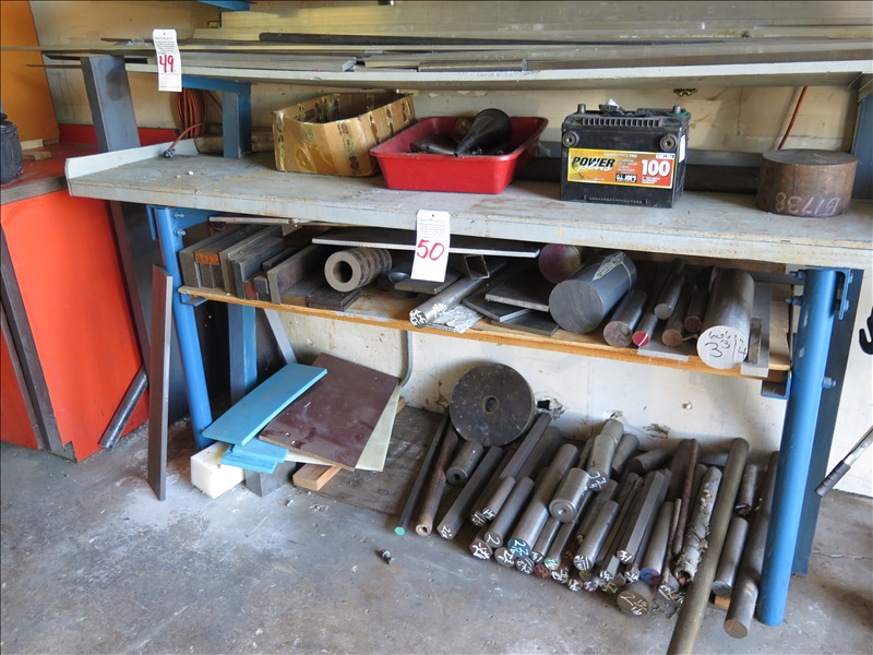 LOT, STEEL WORKBENCH W/SHELF UNIT & MISC STOCK ON THE FLOOR