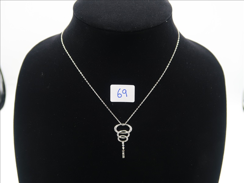 18K WHITE GOLD INTERWINED PENDANT WITH 3 PRONG ROUND DIAMONDS, & 22 PAVE ROUND DIAMONDS ON 3 OVALS PENDANT (DIAMONDS TEST POSITIVE), RETAIL PRICE: $1450, GRAMS:2.12 DIA WT: 0.5