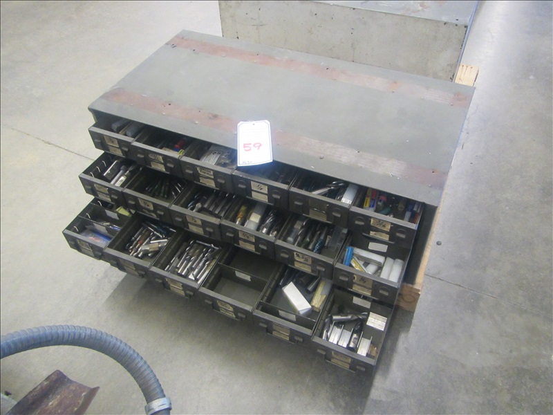 LOT, ASSORTED END MILL BITS W/METAL 18-DRAWER STORAGE CABINET