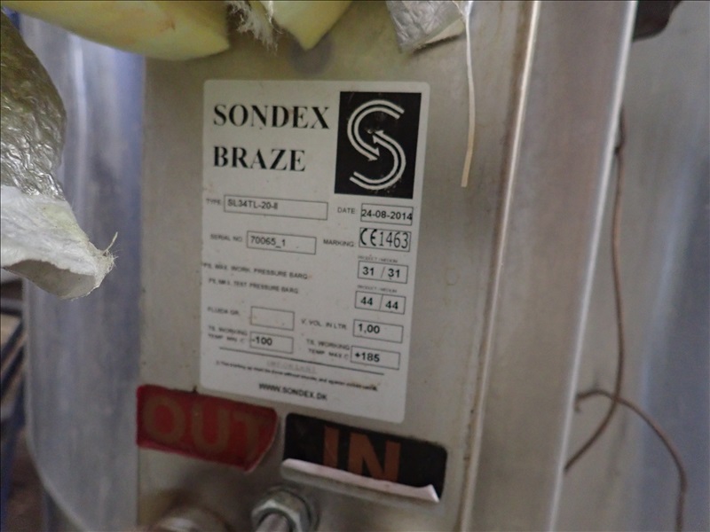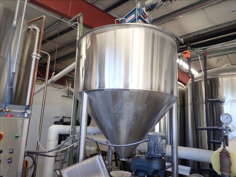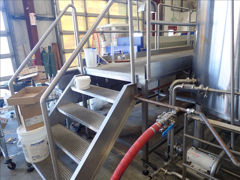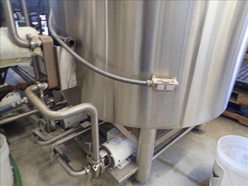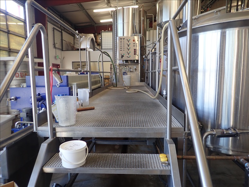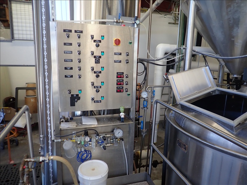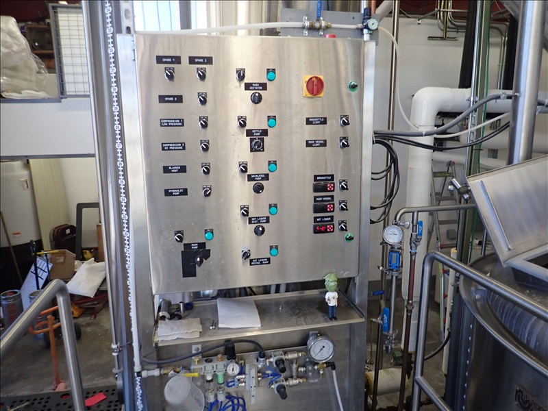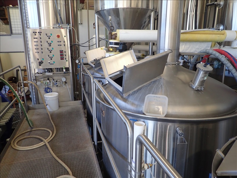 3-VESSEL BREWHOUSE W/JACKETED MASH TUN MIXER, BOIL KETTLE, WHIRLPOOL, 45BBL INSULATED HLT W/SONDEX BRAZE SL34TL-20-II HEAT EXCHANGER, GRAIN HOPPER W/VIBCO PNEUMATIC VIBRATOR, 2014 THERMALINE T13-S-36 HEAT EXCHANGER, TCP CONTROL PANEL, PUMPS, CATWALK, STAIRS & PIPING