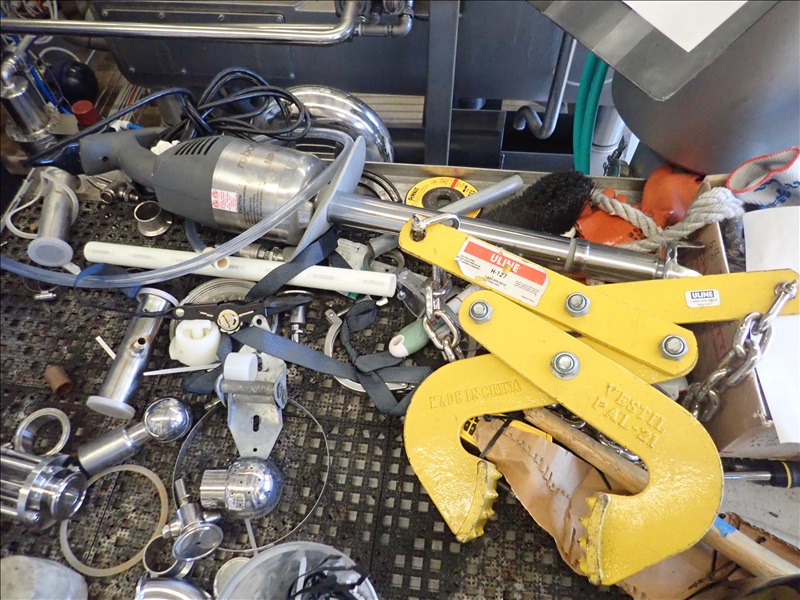 GROUP OF TRANSFER HOSES, FITTINGS, CLAMPS, 3-COMPARMENT SINK, STAINLESS STEEL TABLE, ROBOT COUPE MP450 IMMERSION BLENDER & MISC. BREWING SUPPLIES