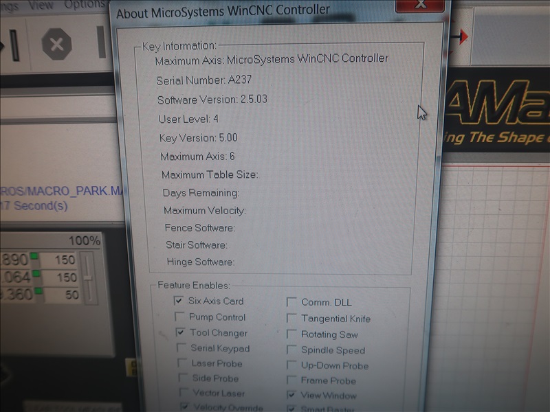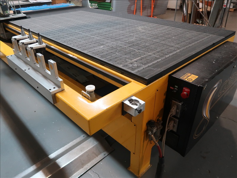ATC 120"X60" CNC ROUTER TABLE, ES929 SPINDLE, RAPID SPEED: 2,500 IPM, CUT SPEED; 1,500 IPM, X AND Y AXIS DRIVE HELICAL RACK & PINION, Z AXIS DRIVE PRECISION BALL SCREW, ATC, MICROSYSTEMS WINCNC CONTROLLER VERSION 2.5.03, 2,940 RPM/MIN VACUUM HOLD DOWN SYSTEM