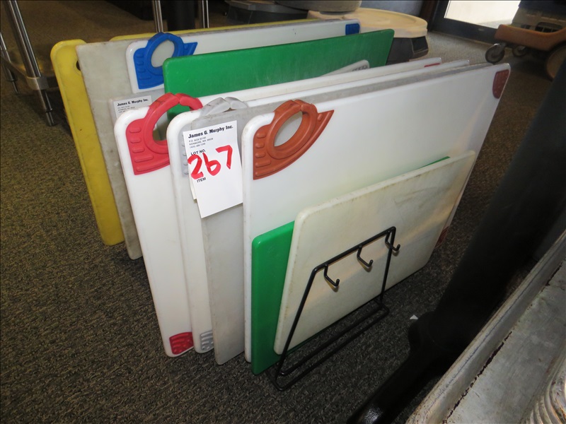 LOT, ASSORTED CUTTING BOARDS W/RACK