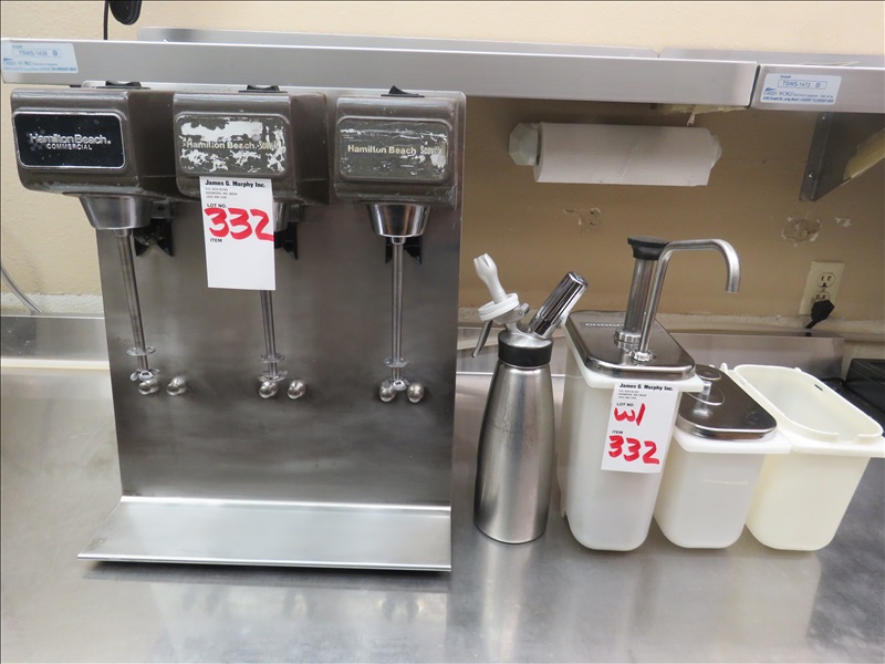 LOT, HAMILTON BEACH 3-HEAD MILKSHAKE MACHINE W/TOPPING ACCESSORIES