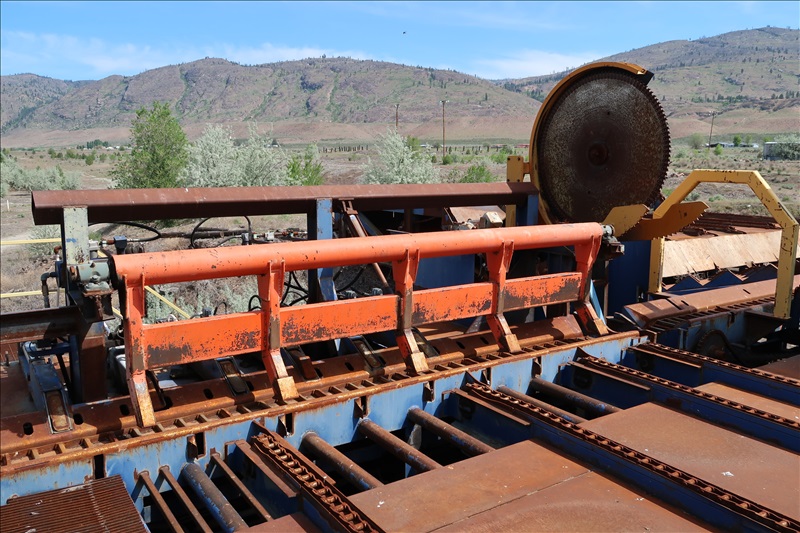 72" INSERT TOOTH WHOLE LOG CUT OFF SAW W/75 HP/1,180 RPM MOTOR, LOG CRADLES & HOLD DOWNS, APPROX 50" - 6"X12" BOX CHAIN INFEED LOG HAUL, APPROX 20' - 6"X12" OUTFEED LOG HAUL W/(6) LOG STOPS, 5-ARM LOG KICKER, (2) MOTORS TO SKK DRIVES, (2) SPARE SAWS