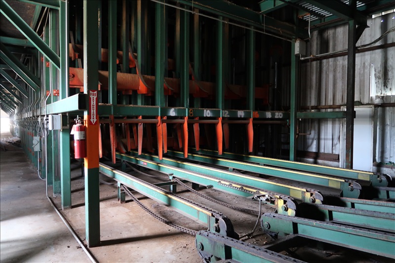 6'-20' 48-BIN J-BAR SORTER W/75 HP MOTOR TO SKK DRIVE, APPROX 200' 7-STRAND 81X FEED THRU TRANSFER, 42" BINS W/APPROX 377 - 2"X4" CAPACITY, 23,500 LB CAPACITY, APPROX 100' 5-STRAND 81X INFEED TRANSFER W/LASER THICKNESS, WEIGHT SCALES & MOISTURE DETECTING