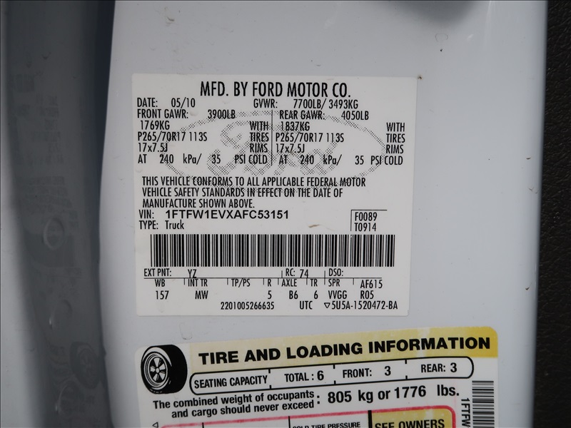 CREW CAB PICKUP TRUCK, TRITON 5.4L 3V ENGINE, AUTO, 6' BED, S/N: 1FTFW1EVXAFC53151, MILES: 139,183