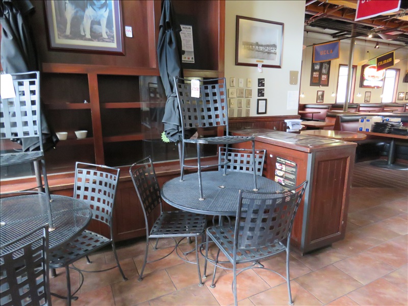 LOT, 41" DIA WROUGHT IRON PATIO TABLE, (4) WROUGHT IRON PATIO CHAIRS & UMBRELLA