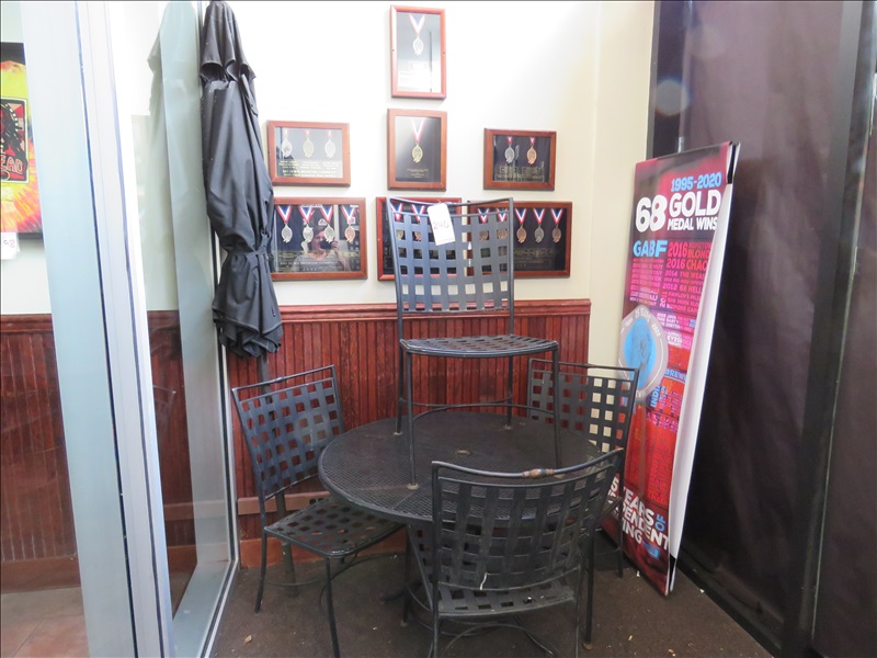 LOT, 41" DIA WROUGHT IRON PATIO TABLE, (4) WROUGHT IRON PATIO CHAIRS & UMBRELLA